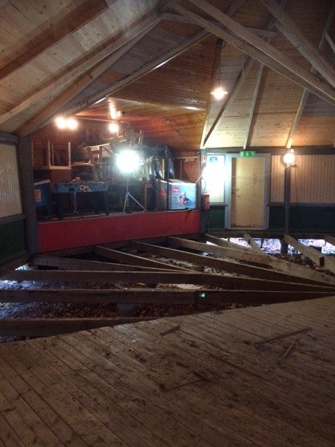 Dansbanan har varit en försummad pärla i många år och träfasaden har gradvis murknat under målarfärgen till fint mjöl av regn och fukt. Under hösten har styrelsen tömt kioskdelen på diverse gamla möbler och annat oanvändbart som ställts in där istället för att köras till återbruket.